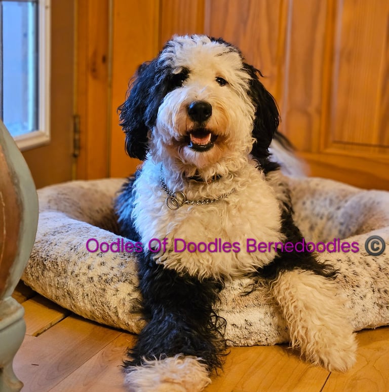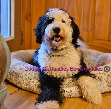 Paris is our black and white Bi-colored F1 Standard Bernedoodle. She was born here and is the daughter to Lilly. She is non shedding and has the most unique color. Paris has an intelligent and playful temperament.