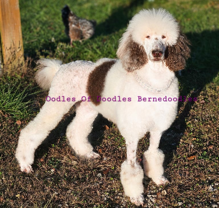 Lilly is our purebred Standard Partie Poodle. She is extremely intelligent and gentle. She is a service/herding dog. Lilly enjoys going on trips and loves learning new tricks.